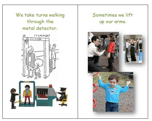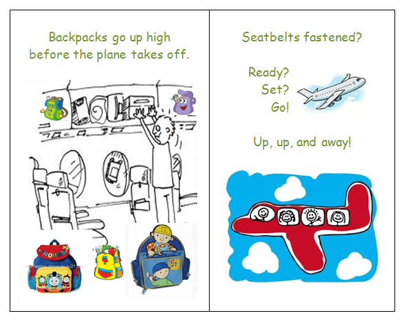 Recently, one of our associates traveled with her 3-year-old son to Northern Ireland. In anticipation of the airport ordeal, we wrote a 24 page picture book of what to expect. It included walking through the metal detector, the pat down, stroller storage, dinner and breakfast, sleeping on the plane, passenger masks, restroom issues, when he would have access to his book bag, changing planes in London, luggage retrieval, and the taxi ride.