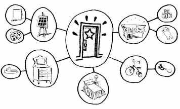 The main topic is then written in the circle. Extending out from the center, lines are drawn which link secondary facts or ideas, which may also be in circles. The web then extends as words and ideas are added. The result is a visual or graphic representation of the story or project. For example, below are two webs from the Texas Education Agency. The first is about a child’s favorite places and the second is about the contents of a child’s room.
